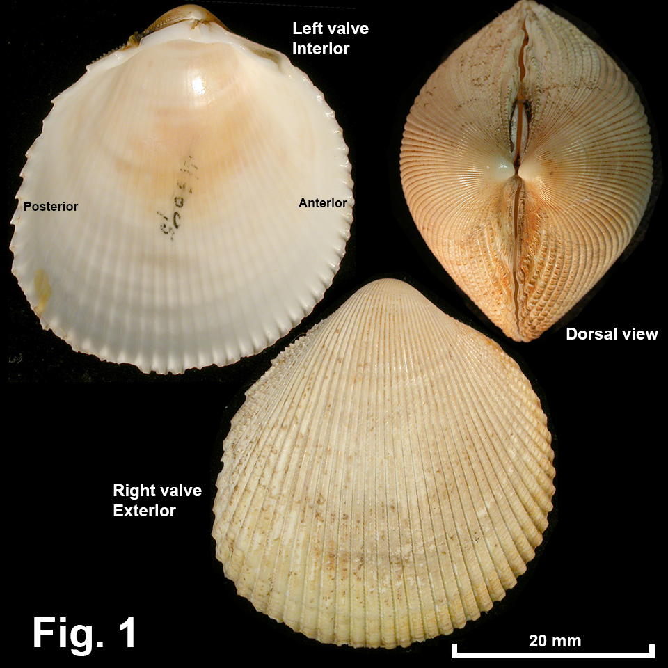 Acrosterigma cygnorum (Deshayes, 1855) Description: Shell moderately light in weight. Shape semicircular, length less than height, weakly angled posteriorly, umbo on midline. Lunule wide, poorly defined, escutcheon absent. Exterior with 35-44 scaled radial ribs continuous from umbo, intervening interspaces much narrower. Interior with exterior ribs showing through; anterior and posterior muscle scars unequal, pallial line not detectable; margin crenulate by external ribs. Interior white, sometimes pink. Hinge as for family. Ligament external, short. Shell colour white, blotched or spotted with reddish-brown, yellow at margin when fresh. Size: Up to 47 mm in length. Distribution: Off Port Hacking, Sydney, southwards and around southern Australia, to Fremantle, WA, including Tas. Habitat: Known from beach washup and dredged down to 80 m. Uncommon in NSW, common in southern Australia. Comparison: This is a fairly lightweight shell similar to Fulvia tenuicostata, but the radial ribs cover the whole surface from umbo to ventral margin, and the umbon is never purple. Synonymy: There are two previously recognised synonyms – Laevicardium gaillardi Fischer-Piette, 1977 and Acrosterigm abrolhosensis J. Vidal, 1999. Fig. 1: Off Eden, NSW in 73-91 m (C.145095) |