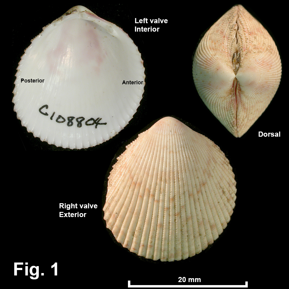 Acrosterigma kerslakae Healy & Lamprell, 1992 Description: Shell moderately light in weight. Shape semicircular, length less than height, weakly angled posteriorly, umbo on midline. Lunule narrow, poorly defined, escutcheon absent. Exterior with 38-42 scaled radial ribs continuous from umbo, intervening spaces very narrow or absent. Interior with external ribs showing through weakly; anterior and posterior muscle scars clearly defined, pallial line not detectable; margin crenulate by external ribs. Interior white, sometimes pink umbonally. Hinge as for family. Ligament external, short. Shell colour cream-yellow with pink-brown spots or blotches. Size: Up to 35 mm in length. Distribution: Southern Qld southwards to Sydney, NSW. Habitat: Known from beach washup and down to at least 25 m depth. Most specimens are from beach washup. Moderately common. Comparison: This species is very similar to A. cygnorum but is consistently smaller. The interspaces between the radial ribs are very narrow and sometimes absent in this species but wider in A. cygnorum. As these species are currently understood, A. kerslakae occurs from Sydney northwards, and does not overlap in range with A. cygnorum. which is a southern Australian species occurring from Sydney southwards. Fig. 1: South Solitary Island, off Coffs Harbour, NSW (C.108804) |