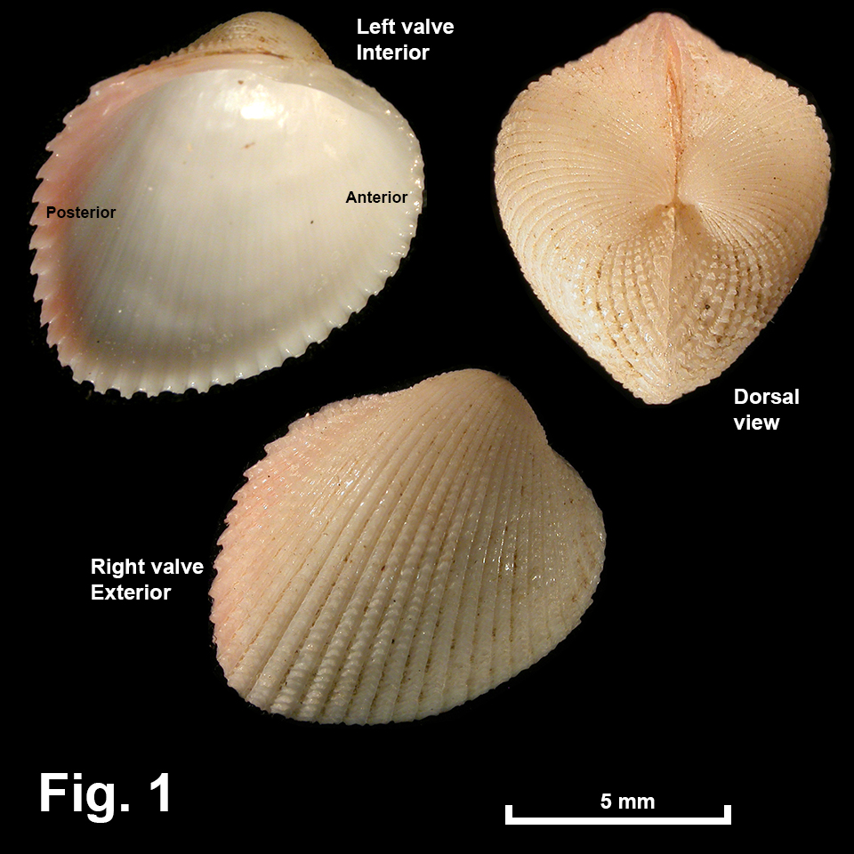 Afrocardium richardi (Audouin, 1826) Description: Shell small. Shape trapezoidal, very inflated, strongly oblique, height equal to length, umbo well in front of midline. Lunule and escutcheon absent. Exterior with about 30 scaled radial ribs, scales stronger posteriorly. Interior with muscle scars and pallial line indistinct, exterior sculpture showing through; margin strongly crenulate, more so posteriorly. Hinge as for family. Ligament external. Shell colour variable but usually white with pink posteriorly. Size: Up to 12 mm in length. Distribution: Tropical Indo-West Pacific including northern Australia. In eastern Australia, as far south as Sydney. Habitat: Known from beach washup and down to 124 m depth. Common in the tropics, rare in NSW. Comparison: In NSW, this species is readily identified by its small size and strongly oblique shape. Synonymy: There are many synonyms; Cardium skeeti Hedley, 1906 has been used in Australian literature. Fig. 1: Port Stephens, NSW (C.014061) |