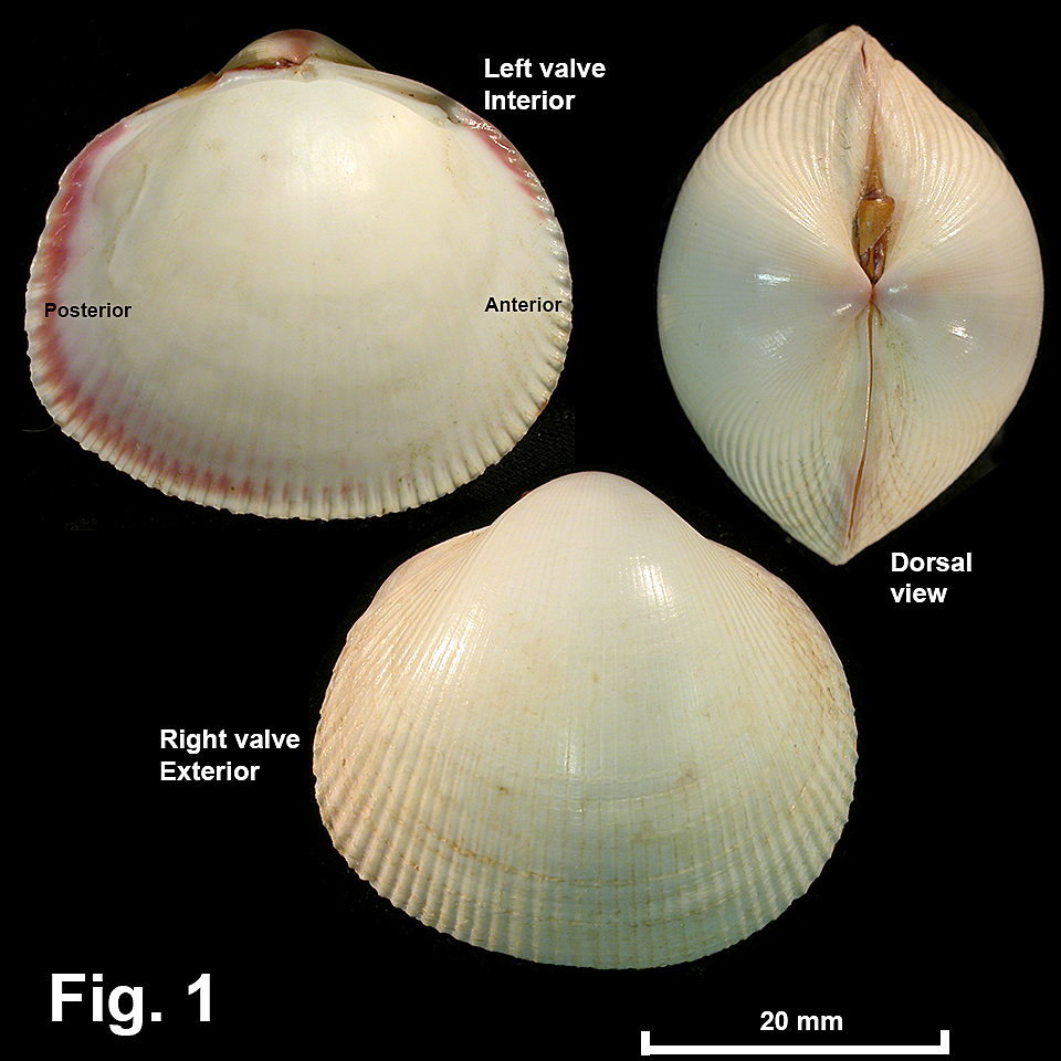 Fulvia tenuicostata (Lamarck, 1819) Description: Shell light in weight. Shape nearly circular, well inflated, length greater than height, weakly angled posteriorly, posterior more angled than anterior. Umbo slightly posterior to midline. Lunule and escutcheon wide. Exterior with about 50 small, rounded radial ribs with narrower interspaces; ribs absent from dorsal third or half of shell. Interior with exterior ribs showing through; anterior and posterior muscle scars distinct, pallial line continuous but indistinct. Margin crenulate by external ribs. Interior white with margin pink. Hinge wide with 2 small cardinal teeth and a large elevated lateral tooth each side. Ligament external, short. Shell white, umbones purple; covered with thin brown periostracum. Size: Up to 62 mm in length. Distribution: Port Stephens, NSW, southwards and around southern Australia, to Perth, WA, including Tas. Habitat: Lives in the shallow subtidal down to about 70 m depth in NSW. In SA, reported by Ludbrook (1984, p. 176) as living gregariously in sand and mud in 2-30 m depth. Often washed up on beaches. Common. Comparison: Fulvia aperta (Bruguière, 1789) and Fulvia australis (G.B. Sowerby II, 1834) are similar tropical species not found in NSW, differing in sculpture and colouration. Synonymy: Fulvia racketti (Donovan, 1825) is a previously recognised synonym. Fig. 1: Gunnamatta Bay, Port Hacking, NSW (C.64371) |