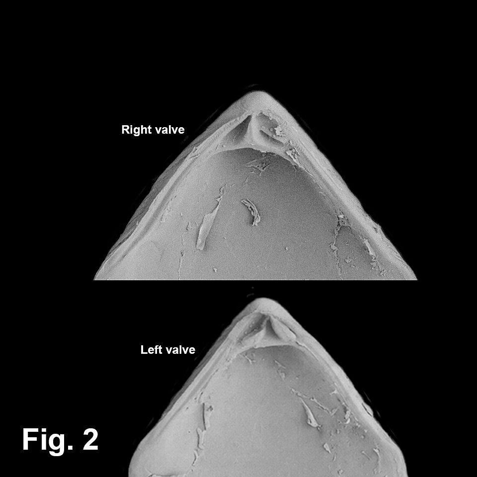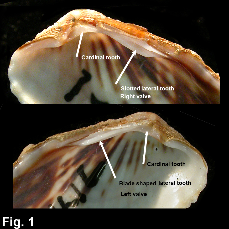 Fig. 1: 8166-1 Hinge details in Cardita aviculina. Fig. 2: 8167-1 Hinge details in Cuna concentrica.