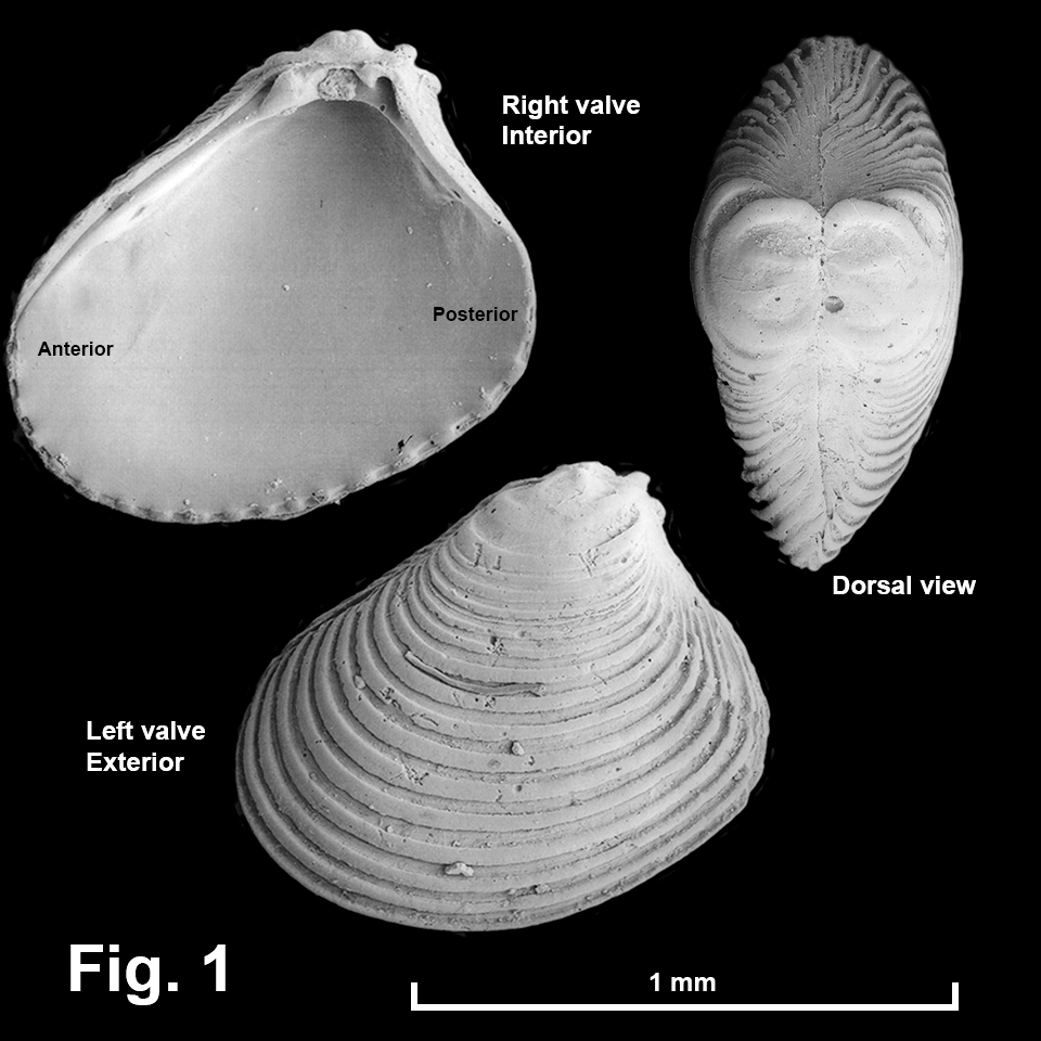 Condylocuna projecta (Hedley, 1902) Description: Shell minute. Prodissoconch relatively large, dome-shaped, surrounded by a commarginal rib and thickened rim. Shape extended anteriorly, umbo well behind midline, anterior and posterior dorsal margins straight or concave, ventral margin smoothly rounded. Lunule and escutcheon short and broad. Exterior with up to 21, strong, flat commarginal ribs below prodissoconch. Interior smooth apart from muscle scars, margin with 18 crenulations. Hinge strong. Ligament internal. Shell translucent to opaque white. Size: Up to 1.3 mm in length. Distribution: Heron Island, Qld, southwards and around southern Australia, to North West Cape, WA, including Tas. Also Coral Sea. Habitat: Known from beach washup and down to 183 m depth. There are 54 lots in the AMS collection, indicating this is a common species. Fig. 1: Sydney Harbour, NSW (C.366908). SEM images by Peter Middelfart, Australian Museum. |