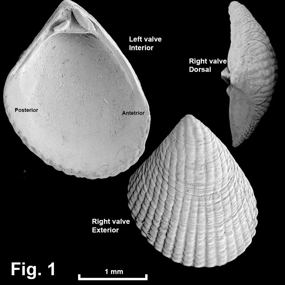 Cuna cuneata (Laseron, 1953) Description: Shell small. Prodissoconch relatively small, dome-shaped, rim thickened. Shape triangular, higher than long, umbo on midline, anterodorsal slope weakly convex, posterodorsal slope weakly concave. Escutcheon wide, lunule narrower. Exterior with 20-21 radial ribs that do not radiate from prodissoconch area but are perpendicular to hinge area, crossed by commarginal growth lines. Interior smooth apart from muscle scars; margin with about 20 denticles. Hinge strong. Ligament internal. Shell opaque white. Size: Up to 2.2 mm in length. Distribution: Known only from Sydney, NSW. Habitat: Known from beach washup and down to 26 m. The AMS collection holds only 4 lots of this species, suggesting it is rare. Comparison: This species is similar to Cuna saza, but the two species differ in the geometry of the rib radiation; in C. saza the ribs radiate from the prodissoconch, while in C. cuneata they are perpendicular to the hinge area, a condition that is unusual for any bivalve. Synonymy: None Fig. 1: Off Long Reef, Collaroy, NSW (C.90562, SYNTYPES). SEM image by Peter Middelfart, Australian Museum. |