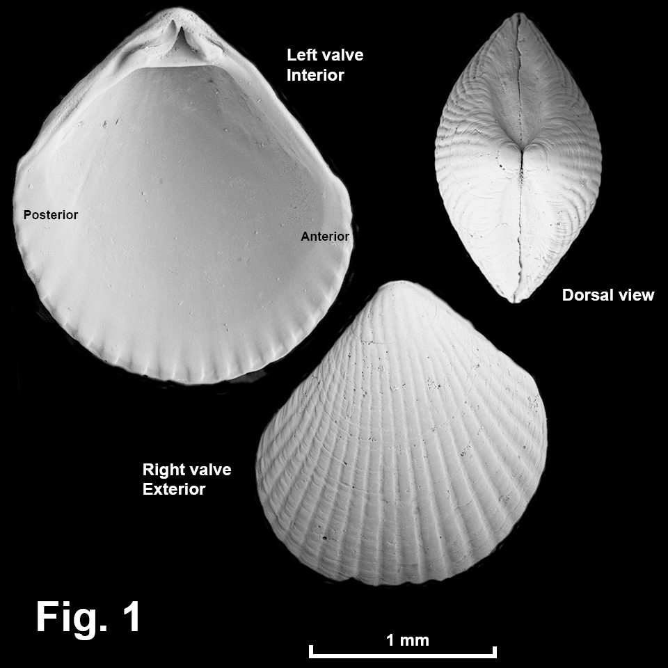 Cuna saza (Laseron, 1953) Description: Shell minute. Prodissoconch small, dome-shaped, rim thickened. Shape umbo on midline, anterodorsal and posterodorsal margins straight or weakly convex. Escutcheon wide, lunule narrower. Exterior sculpture of 20-23 radial ribs, crossed by growth lines. Interior smooth apart from muscle scars, margin with 20-23 denticles. Hinge strong. Ligament internal. Shell translucent to opaque white. Size: Up to 2.2 mm in length. Distribution: Seal Rocks, NSW, southwards to Mallacoota, eastern Vic. Habitat: Known from beach washup and down to 27 m depth. The AMS collection holds 32 lots, indicating this species is moderately common. Comparison: This species is characterised by the relatively numerous radial ribs. Synonymy: None Fig. 1: Collaroy Beach, NSW (C.385974). SEM images Peter Middelfart, Australian Museum. |