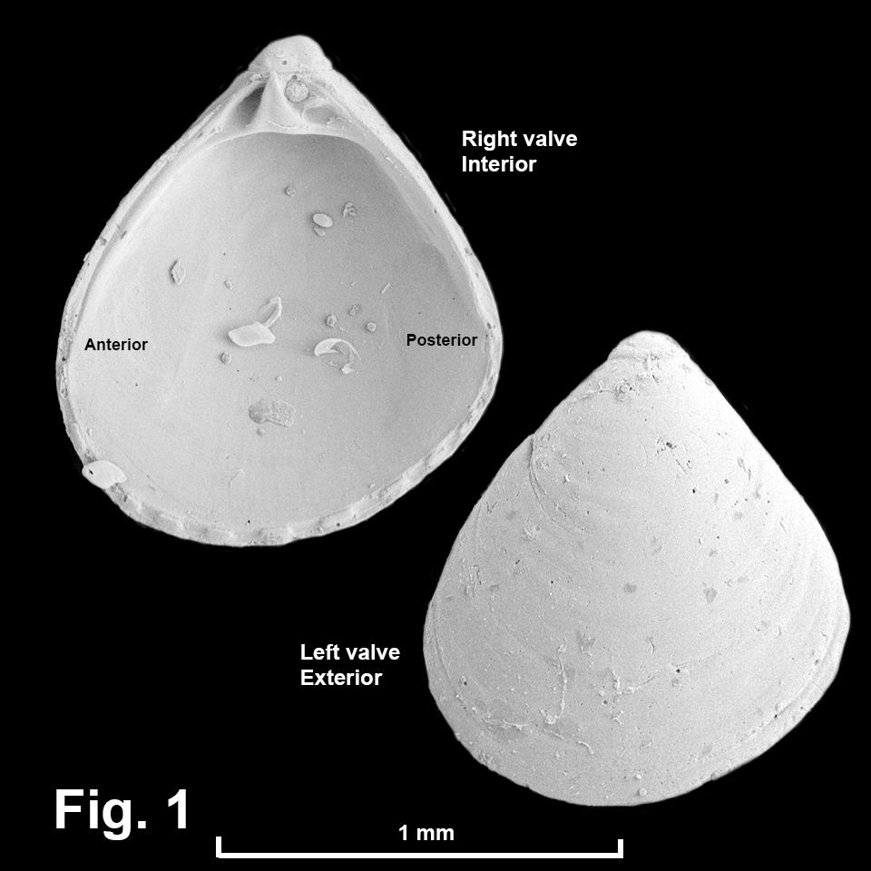 Cuna vitrea (Laseron, 1953) Description: Shell minute. Prodissoconch small, dome-shaped, rim thickened. Shape triangular, umbo slightly posterior to midline, anterodorsal and posterodorsal margins weakly convex. Escutcheon wide, lunule narrower. Exterior without sculpture, or with weak, low commarginal ribs. Interior margin smooth or with 10-11 denticles. Hinge strong. Ligament internal. Shell translucent when live, opaque white when dead. Size: Up to 1.2 mm in length. Distribution: From Swain Reefs, Qld, southwards to Sydney, NSW. Habitat: Known from beach washup and down to 86 m depth. The AMS collection holds 11 lots, suggesting this is an uncommon species. Comparison: This species is characterised by the weak or absent exterior sculpture. In describing the species, Laseron (1953) said “Sculpture practically none, confined to a few irregular growth lines”, but subsequent collecting has revealed specimens with weak commarginal ribs. Synonymy: None. Fig. 1: Exterior: Narrabeen Beach, Sydney, NSW (C.407758 LECTOTYPE of Warrana vitrea Laseron, 1953. Interior: Narrabeen Beach, Sydney, NSW (C.90564, PARALECTOTYPE). SEM images by Peter Middelfart, Australian Museum. |