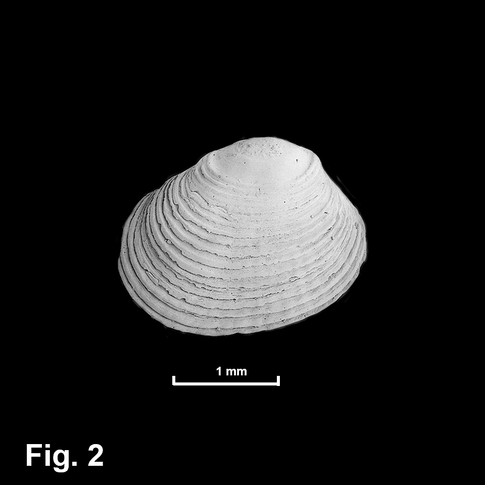 Cunanax pisum (Hedley, 1908) Description: Shell small and solid. Prodissoconch (Fig. 2) low, dome-shaped, initially pitted then smooth with sharp rim. Shape extended anteriorly, umbo behind midline, anterior and posterior dorsal margins straight or weakly concave. Lunule and escutcheon long and broad. Exterior with up to 36, strong, close, commarginal ribs, and 18-21 weaker broad, radial ribs, more developed ventrally. Interior smooth, with strongly crenulate margin. Hinge strong. Ligament internal. Shell opaque white. Size: Up to 9 mm in length. Distribution: Fraser Island, Qld, southwards to Ulladulla, NSW. Habitat: Known from beach washup and down to 201 m depth. There are 29 lots in the AMS collection, indicating this is a fairly common species. Comparison: This species is recognised by its relatively large size and presence of radial and commarginal sculpture. Synonymy: Condylocuna moringa Laseron, 1953, from off North Head, Sydney, is a previously recognised synonym. Fig. 1: 5.4 km east of North Head, Sydney (C.366513) Fig. 2: Off North Head, Sydney (C.090555 HOLOTYPE of Condylocuna moringa). SEM image Peter Middelfart, Australian Museum. |