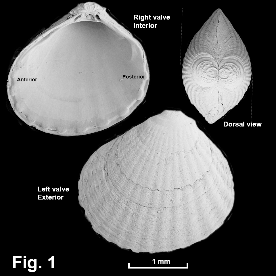 Cunanax subradiata (Tate, 1889) Description: Shell small. Prodissoconch with 1 or several commarginal ribs and sharp rim. Shape slightly extended anteriorly, umbo located behind midline; anterior and posterior dorsal margins straight or weakly concave. Lunule and escutcheon short, narrow, smooth. Exterior sculpture of irregular commarginal growth lines and 12-16 broad, low radial ribs. Interior smooth, with strongly dentate margin. Hinge strong. Ligament internal. Shell opaque white. Size: Up to 4.4 mm length. Distribution: From Euston Reef, Qld, southwards and around southern Australia, to Dongara, WA, including Tas. Habitat: From beach washup and down to 219 m. Comparison: Similar to Cunanax pisum but has a wider distribution around southern Australia. The radial ribs are present over the whole surface, but restricted to the ventral margin in C. pisum. Synonymy: Previously recognised synonyms are Condylocardia porrecta Hedley, 1906 from Masthead Island, Radiocondyla ampla Laseron, 1953 from Sydney, and Radiocondyla rotunda Laseron, 1953 from off Crookhaven, NSW Fig. 1: Interior: reg. no. unknown. Dorsal: Off Ballina, NSW (C.379240). Exterior: South of King Island, Tas (C.379864). SEM images Peter Middelfart, Australian Museum. |
