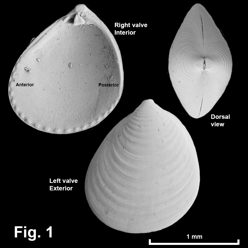 Ovacuna atkinsoni (Tenison-Woods, 1876) Description: Shell small. Prodissoconch small, domed, elevated, nipple-like. Shape almost circular, ovate posterior to midline; anterodorsal and posterodorsal margins convex; escutcheon and lunule absent. Exterior with up to 19 weak, low, rounded commarginal ridges, plus growth lines. Interior smooth, ventral margin smooth or strongly dentate. Hinge strong, with 1 of the teeth bifid. Ligament internal. Shell translucent to opaque white. Size: Up to 2.7 mm in length. Distribution: Capricorn Channel, Qld, southwards and around southern Australia to Rottnest Island, WA, including Tas. Habitat: Known from beach washup and down to 295 m depth. The AMS collection holds 125 lots, indicating it is a common species. Comparison: This species stands out because of its ovate shape with nipple-like umbo, and one of the hinge teeth bifid. Synonymy: Previously recorded synonyms are Cuna solida Cotton, 1931 from SA and Warrana eccentrica Laseron, 1953 from NSW. Fig. 1: North-east of Cape Moreton, Qld (C.386355). SEM images by Peter Middelfart, Australian Museum. |