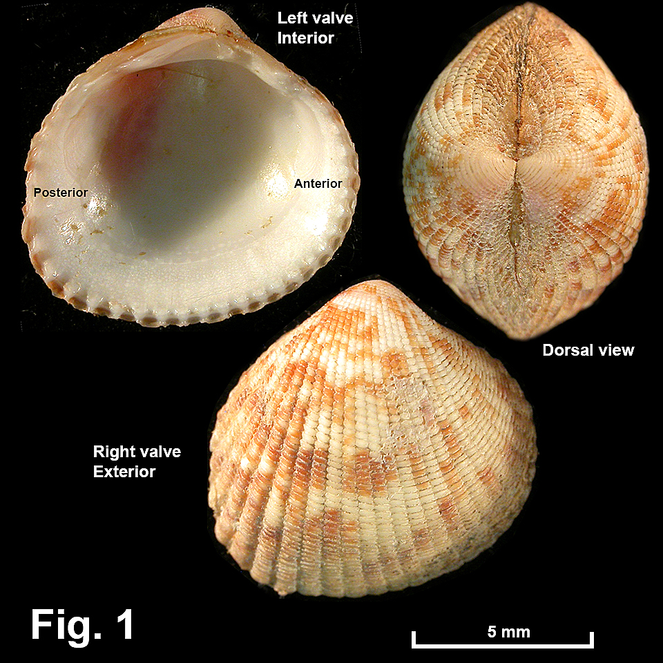 Vimentum dilectum (E.A. Smith, 1885) Description: Shell well inflated. Shape umbo located on midline; anterior dorsal margin slightly concave, posterior dorsal margin straight to slightly convex; ventral margin smoothly rounded. Lunule not strongly defined, large, shallow. Exterior with about 28 radial ribs with narrow interspaces, crossed by dense, more closely spaced commarginal grooves, forming brick-shaped nodules. Interior with external sculpture showing through weakly; anterior and posterior muscle scars well defined, pallial line continuous; margin coarsely crenulate. Hinge strong; left valve with single cardinal tooth and long, blade-shaped lateral; right valve with cardinal and strong, slotted lateral. Ligament external. Shell colour white with irregular patches of light or dark brown. Interior white or pale pink. Size: Up to 10 mm length. Distribution: Endemic to Australia: Cape Moreton, Qld, southwards and around southern Australia, to south-western WA, including Tas. Habitat: Subtidal 50-300 m. Fig. 1: 2.2 km east of Cape Banks, NSW, in 49 m depth (C.36377)
