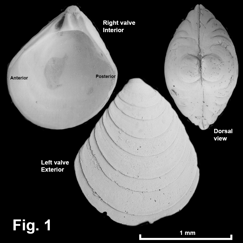 Warrana dielasma Laseron, 1953 Description: Shell minute. Prodissoconch small, domed, smooth, with thickened rim. Shape triangular dorsally, semicircular ventrally, higher than wide, umbo on midline. Anterior and posterodorsal margins straight to convex. Escutcheon wide, lunule narrower. Exterior with widely and irregularly spaced narrow commarginal riblets, plus growth lines. Interior smooth, margin smooth or with 11-12 denticles. Hinge strong. Ligament internal. Shell translucent to opaque pale brown. Size: Up to 1.4 mm in length. Distribution: From off Forster, NSW, southwards to Mallacoota, Vic. Habitat: Known from beach washup and down to 182 m depth. The AMS collection holds on 12 lots of this species, suggesting it is uncommon. Comparison: In NSW this is characterised by the narrow, widely spaced commarginal ribs and pale brown colour. Fig. 1: Interior: Mallacoota, Vic. (C.504497) Dorsal view: Collaroy Beach, NSW (C.366738) Exterior: Off Twofold Bay, NSW (C.406410). SEM images by Peter Middelfart, Australian Museum. |