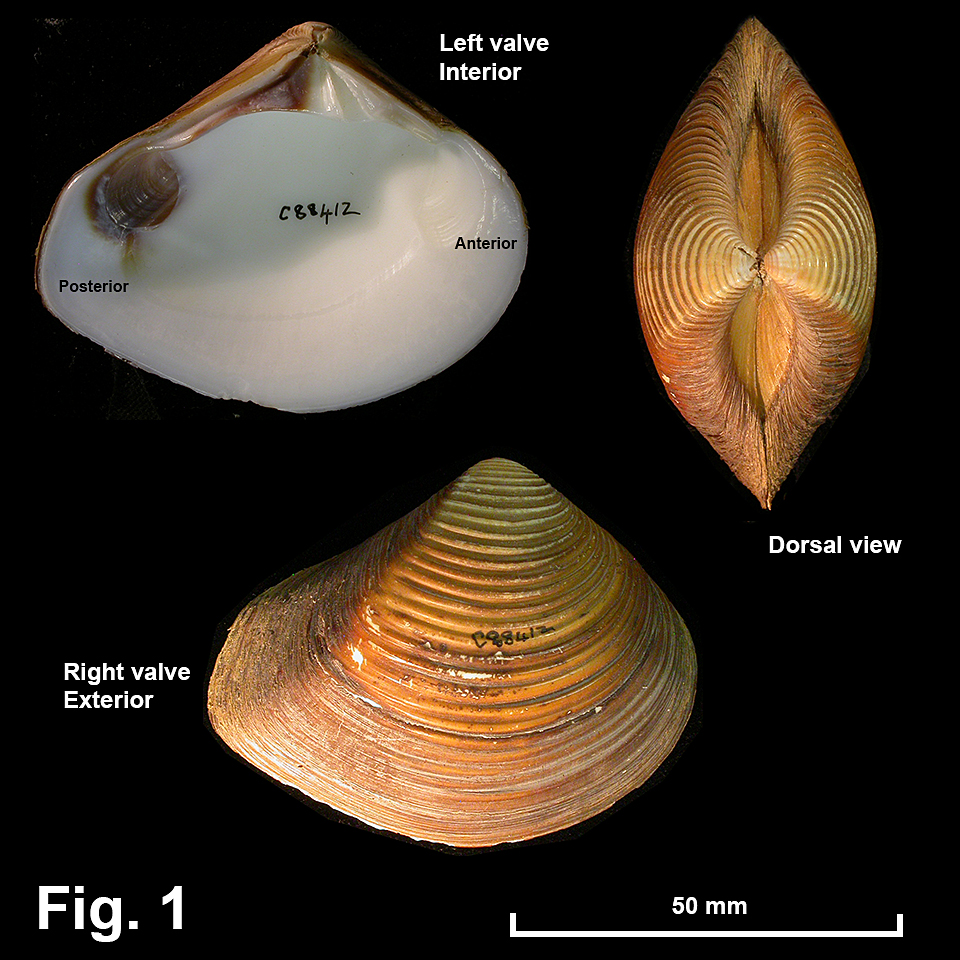 Eucrassatella cumingii (A. Adams, 1854) Description: Shell solid and heavy. Shape roughly triangular, well inflated, extended posteriorly, umbo situated in front of midline. Anterior dorsal margin straight, posterior dorsal margin slightly concave, ventral margin smoothly rounded, posterior end angled. Lunule and escutcheon large and clearly defined. Exterior with strong, regular, commarginal ridges dorsally, becoming weaker and irregular ventrally. Interior white, muscle scars well defined, the posterior one usually brown. Pallial line continuous, margin smooth. Hinge strong. Ligament internal, below umbo. Shell colour white. Periostracum thick, dark brown. Size: Up to 70 mm in length. Distribution: Vanuatu (supposedly) and Australia. In Australia, from Cape York, Qld, southwards to Crescent Head, NSW. Habitat: Low intertidal in sand down to 90 m. Comparison: Eucrassatella kingicola is a similar southern Australian species, in NSW, found only in the far south Synonymy: Eucrassatella genuina Iredale, 1936 is a synonym. Fig. 1: South West Rocks, Trial Bay, NSW (C.088412) |