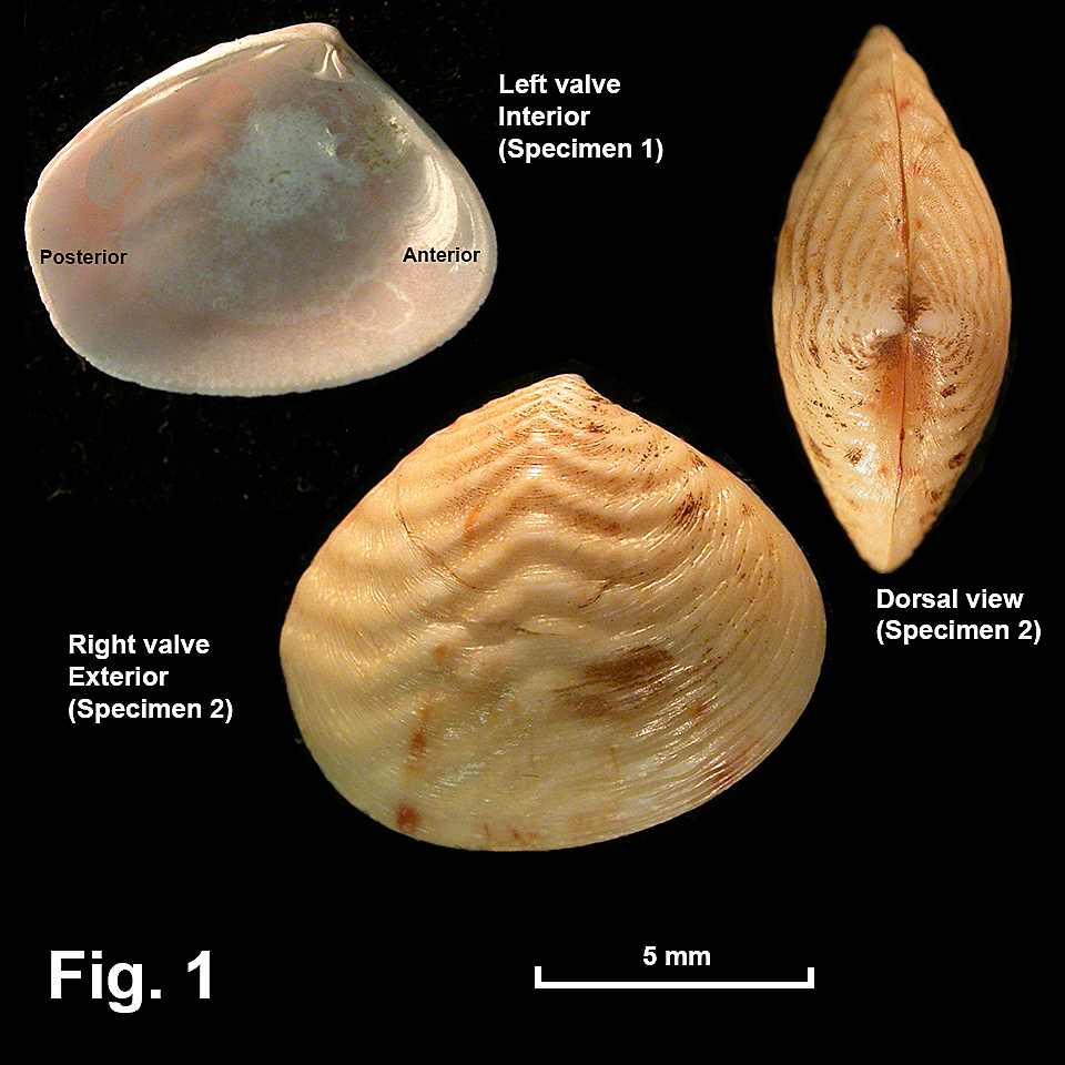 Fluctiger royanus Iredale, 1924 Description: Shape suborbicular to subtriangular, slightly longer than high, umbo situated anteriorly to midline. Anterior dorsal margin slightly concave, posterior dorsal margin slightly convex, ventral margin smoothly rounded. Lunule well-defined, escutcheon absent. Exterior with 2 sets of strong, rounded ribs, meeting on midline, on which are superimposed much finer and denser commarginal threads. Interior with muscle scars well defined, pallial line continuous, margin very finely denticulate. Hinge strong, crassatellid in form. Ligament internal, below umbo. Shell colour fawn or white, with 3 broken rays of dark brown in the only fresh specimen available. Size: Up to 10.5 mm in length. Distribution: Port Macquarie, NSW, southwards to Green Cape, southern NSW, this range being established from the 3 lots held by the Australian Museum. Habitat: Known from 47-109 m depth. Fig. 1: Specimen 1: South of Port Macquarie, NSW, in 47 m (C.368074). Specimen 2: 5.6 km east of North Head, Sydney in 66 m (C.368073) |