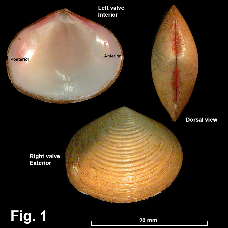 Talabrica aurora (A. Adams & Angas, 1864) Description: Moderately inflated, longer than high. Shape elliptical, umbo situated on midline; anterior and posterior dorsal margins straight, ventral margin smoothly rounded; lunule and escutcheon narrow, poorly defined, sometimes pink. Exterior with regular, strong, commarginal ridges. Interior partly pink, muscle scars well defined, pallial line continuous. Margin very finely denticulate in large shells. Hinge strong, crassatellid in form. Ligament internal, below umbo. Shell exterior colour white, in southern shells with 2 interrupted brown rays. Periostracum thick, continuous, fawn. Size: Up to 26 mm in length. Distribution: Endemic to Australia: Tweed Heads, NSW, southwards to Tas. Habitat: Subtidal, 37-263 m depth. Remarks: Victorian and Tasmanian specimens show 2 interrupted brown radial colour bands, but these are faint or, usually, absent on NSW specimens. Synonymy: Crassatella simplex Kobelt, 1886 ·is a synonym Fig. 1: Off Bournda Island, north of Bermanui, NSW, in 37 m. |