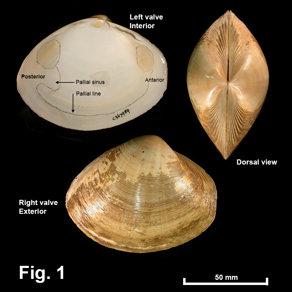 Mactra eximia Reeve, 1854 Description: Shell large, moderately lightweight. Shape semicircular, ovate with low umbo. Umbo located slightly anterior to midline. Exterior smooth or with fine commarginal riblets, sometimes restricted to ventral half; strong riblets either side or umbo at dorsal margin. Interior smooth apart from anterior and posterior muscle scars; pallial line continuous with deep sinus posteriorly. Hinge as for family. Ligament internal. Shell exterior fawn, sometimes with darker rays. Interior white. Periostracum thin, dark brown. Size: Up to 105 mm in length. Distribution: Endemic to Australia: Mackay, Qld, southwards to Batemans Bay, NSW. Habitat: Most specimens are from beach washup, with a few taken live by trawlers down to 55 m depth. Moderately common. Fig. 1: Broulee, NSW (C.367989) |