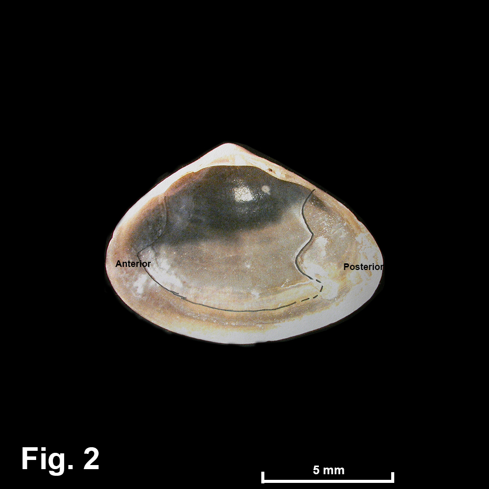 Mactra jacksonensis E.A. Smith, 1885 Description: Shell small, translucent or opaque. Shape elongate, length greater than height, umbo on or slightly anterior to midline; anterior end broadly rounded, posterior end more pointed; ridge from umbo to postero-ventral margin. Exterior smooth apart from weak commarginal growth lines. Interior white blotched with fawn, sometimes with 3 brown radial rays; usually smooth, pallial lines and muscle scars usually not evident; pallial sinus shallow (Fig. 2). Hinge as for family. Ligament internal. Shell white or fawn externally, brown radial rays sometimes visible externally but usually more obvious internally. Size: Up to 14 mm in length. Distribution: Endemic to Australia: Caloundra, Qld, southwards and around southern Australia, to southwestern WA, including Tas. Habitat: Lives in sand in the shallow subtidal zone, down to 64 m. Commonly found in beach washup. Comparison: Mactra pusilla is similar to this species, but has the umbo behind the midline. Mactra jacksonensis is further differentiated from small specimens of M. pusilla by having a shallow pallial sinus and lacking purple on the umbones and interiorly. Synonymy: Mactra matthewsi Tate 1889 is this species, described from SA. Fig. 1: Port Jackson (Sydney Harbour) NSW (C.016186) Fig. 2: Right valve interior with scars drawn in. Discoloured specimen (C.347027) |