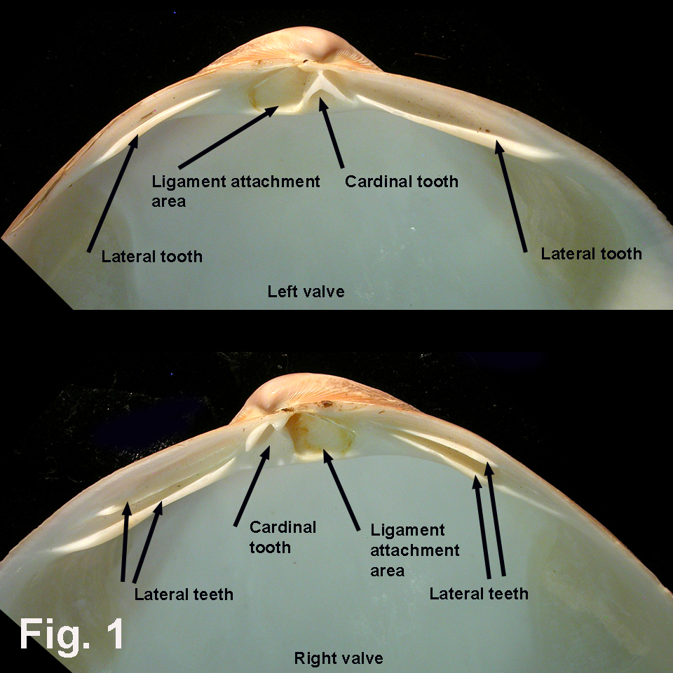 Identification Notes Shell form Medium to large shells from 14 mm up to 120 mm in length, with shell fairly smooth or with weak commarginal sculpture. Hinge There is a characteristic inverted V-shaped cardinal tooth in the left valve and a matching but smaller cardinal in the right valve (Fig. 1). There are lateral teeth in both valves - single blade-like laterals in the left valve and matching slotted laterals in the right valve. The ligament joining the valves is very distinctive in mactrids. It consists of a small to obsolete external section plus a large spoon-shaped internal section that fits into a special socket (a resilifer, or a chondrophore if it projects into the valve below the hinge, which is usually the case) that lies immediately under the umbo and so separates the cardinal teeth. Shell interior Two adductor muscle scars are usually apparent. The pallial line shows a large indentation posteriorly where the siphons are accommodated when they are withdrawn. Fig. 1 Mactridae hinge structure (Mactra eximia, DLB5706)