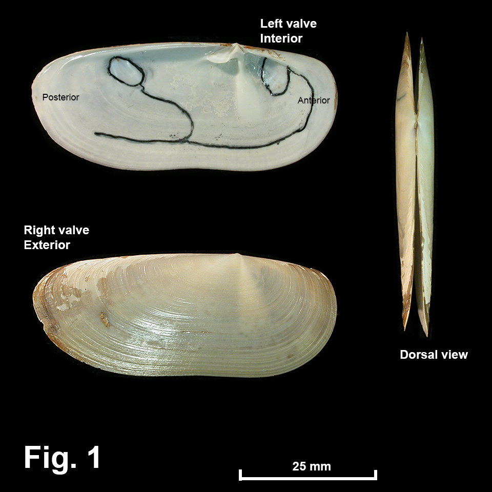 Zenatina victoriae (Pritchard & Gatliff, 1903) Description: Lightweight, fragile. Shape slender, very elongate, almost lanceolate; length more than twice the height, weakly inflated; umbo at anterior third; gaping at both ends. Exterior smooth apart from irregular growth ridges. Interior white, smooth, muscle scars well developed, pallial sinus large, extending to midline. Hinge as for family. Ligament internal, attached to a large freestanding resilifer. Shell white. Periostracum thin, brown. Size: Up to 75 mm in length. Distribution: Endemic to Australia: Noosa River, Qld, southwards to Wilsons Promontory, Vic. Habitat: Known from beach washup and down to 27 m. Fairly common. Comparison: This species is thin and fragile. It is mainly known from beach shells and is restricted to eastern Australia. Lutraria rhynchaena is larger, more solid, and has a wider distribution across all of southern Australia. Fig. 1: Boydtown Beach, Twofold Bay, NSW (C.36840 |