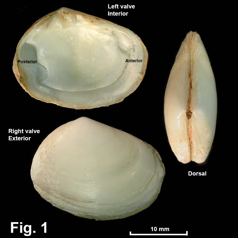 Atactodea cuneata (Lamarck, 1818) Description: Shape elongate-ovate, longer than wide, umbo behind midline. Postero-dorsal slope convex, antero-dorsal slope straight. Exterior smooth, with weak commarginal growth ridges. Interior with pallial line and muscle scars strongly incised; pallial sinus fairly shallow, about one-quarter of shell length in depth; margin smooth. Hinge as for family. Ligament internal. Shell white. Periostracum thin, smooth, brown. Size: Up to 30 mm in length. Distribution: Endemic to Australia: Sydney, NSW, southwards and around southern Australia, to WA including Tas. Habitat: Lives in sand intertidally; in NSW, mainly in sheltered harbours. Comparison: This species differs from Paphies angusta by being more ovate and having the postero-dorsal margin convex. Remarks: Cotton (1961) noted that this species is very variable in shape, with some specimens being almost equilateral. Fig. 1: 8237-1 Gunnamatta Bay, Port Hacking, NSW (C.303607) |