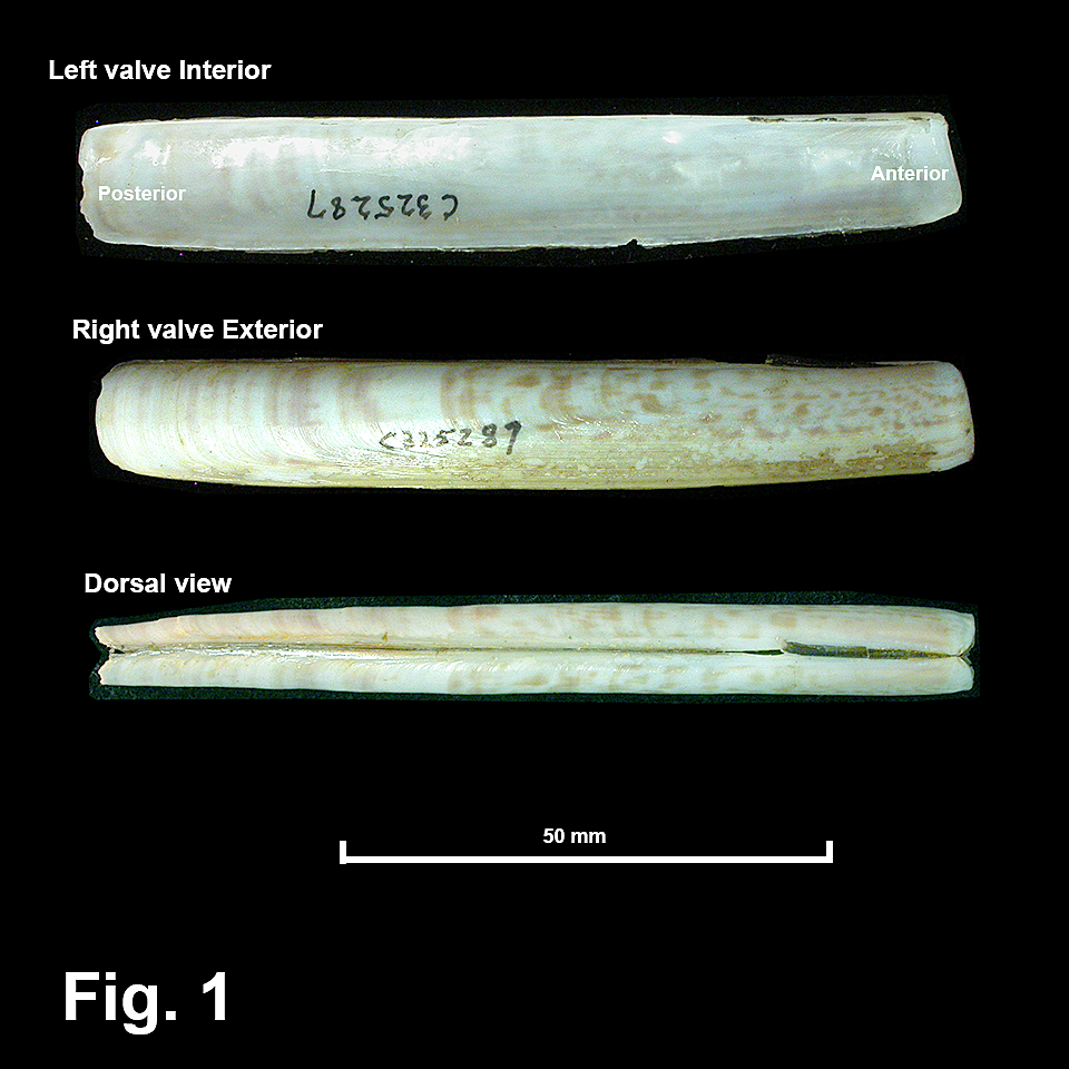 Solen vaginoides Lamarck, 1818 Description: Shape very elongate, straight or slightly curved, gaping at both ends. Exterior smooth. Interior with anterior adductor muscle scar very long, posterior scar about half as long as anterior scar. Pallial line clearly defined, pallial sinus deep. Hinge at anterior end, with one strong cardinal tooth in each valve, laterals absent. Ligament external, at anterior end, about one-sixth of shell length. Shell exterior white with curved pale brown lines or blotches; interior white. Periostracum thin, smooth, brown. Size: Up to 102 mm in length. Distribution: Endemic to Australia: central Qld, southwards and around southern Australia, to WA, including Tas. Several undescribed or recently described Solen species occur in northern Australia (e.g. Solen darwinensis von Cosel, 2002); these were confused with S. vaginoides causing its range to be incorrectly extended northwards by some authors. Habitat: Lives buried in sand in sheltered inlets, with the short siphons extending up to clear water. Cotton (1961) described the behaviour in South Australia: