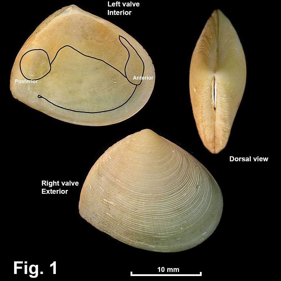 Shape roughly triangular, umbo behind midline; postero-dorsal