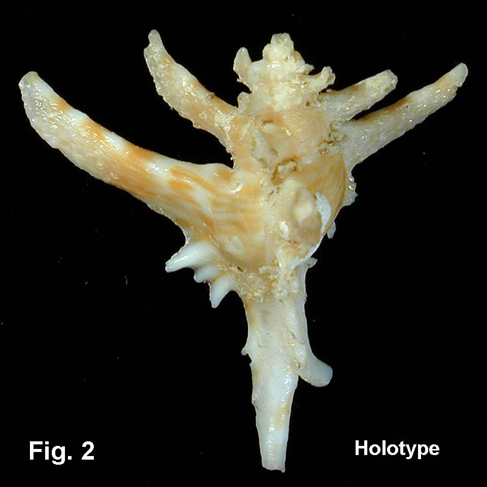 Ponderia abies Houart, 1986 Description: Spire moderately low, sutures impressed. Three varices per whorl, each with a long, flat, closed spine at the shoulder with a flange bearing three spinelets below. Axial or spiral sculpture absent. Aperture roundly ovate with peristome entire, smooth internally, produced beyond columella. Siphonal canal long and hollow, sealed for two-thirds of its length. Colour mottled white and light brown, small spinelets and siphonal canal mainly glossy white. Size: Holotype 20 mm in length. Distribution: Known only from the Taupo Seamount, 400 km east of Newcastle, NSW. Habitat: Taken in 154-164 m. Known only from holotype. Figs. 1,2: HOLOTYPE Taupo Seamount, 400 km east of Newcastle, NSW, in 154-164 m (C.144982)