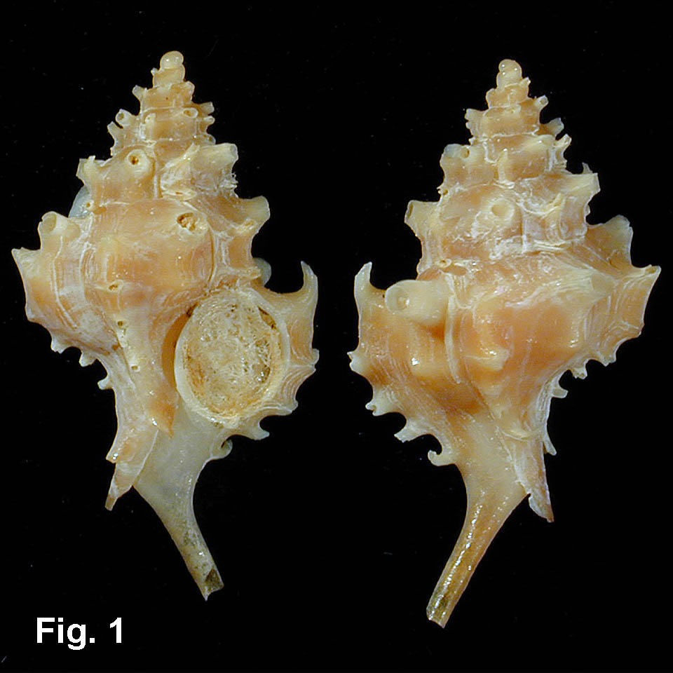 Typhis phillipensis Watson, 1883 Description: Whorls angled, with four varices per whorl, each with four or five short points and a backward pointing spine on the shoulder. Siphonal tubes on the shoulder, midway between the varices, with a nodule below. Spiral sculpture consists of five faint ribs associated with the varical points. Aperture almost circular, with both inner and outer lip projecting past the last varix. Anterior canal closed. Colour white or fawn, operculum corneous. Size: Up to 22 mm in length. Distribution: Endemic to Australia; Moreton Bay, Qld, to Lakes Entrance, Vic. Habitat: Known from 20-200 metres; uncommon. Comparison: Typhis yatesi (Crosse & Fischer, 1865), which occurs in Victoria and South Australia, is similar, but has frilled varices, lacking the spines of Typhis phillipensis. Synonyms: Typhis philippensis interpres Iredale, 1924 Remarks: The name of this species has been spelt incorrectly as T. philippensis in most literature, with an incorrect date of 1886. Fig. 1: Off Eden, NSW, in 101 m (C.354171) Update History: Name corrected from Typhis philippensis Watson, 1886 to Typhis phillipensis Watson, 1883 |